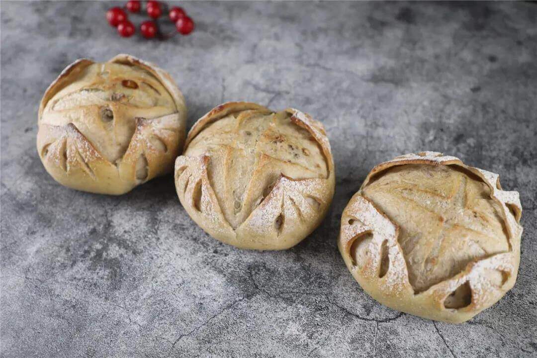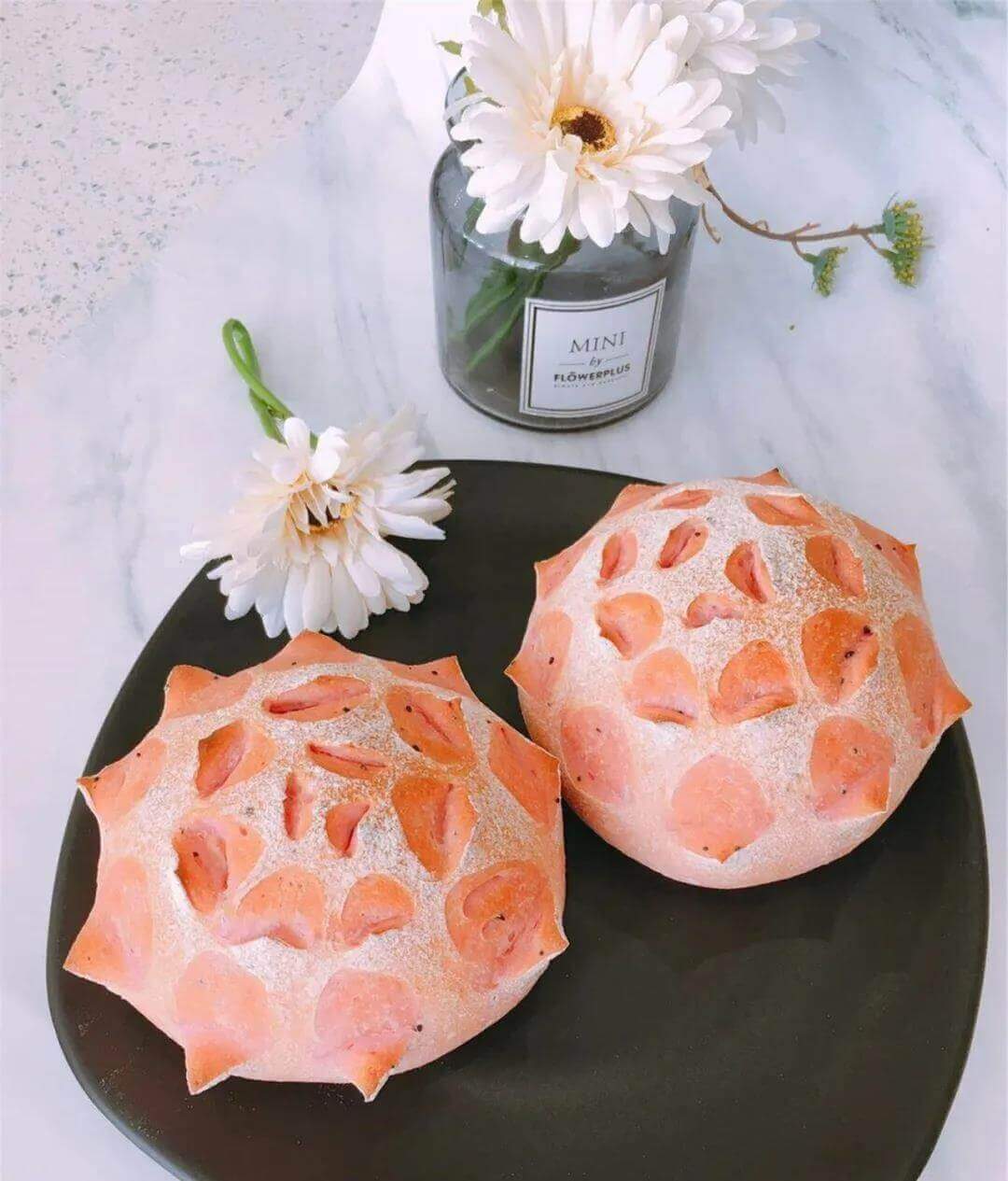 ?烘焙:可以烘焙前在面包表面撒上香酥粒料,入180℃~200℃的烤爐中烤至面包膨脹、色澤金黃時即可出爐。