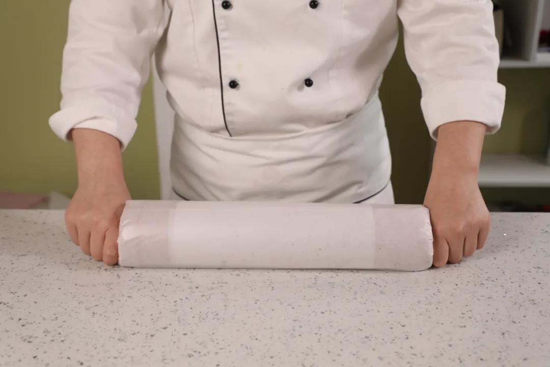 芋泥奶凍切1cm丁塊,撒上,卷起,冷藏半個(gè)小時(shí)左右;