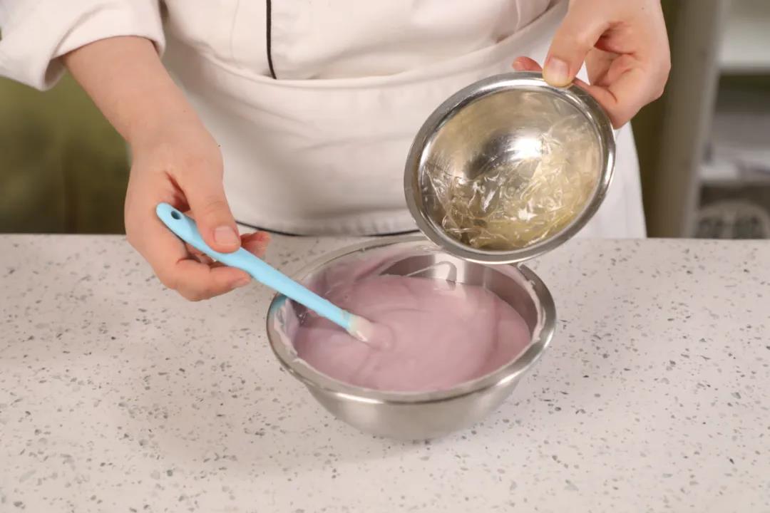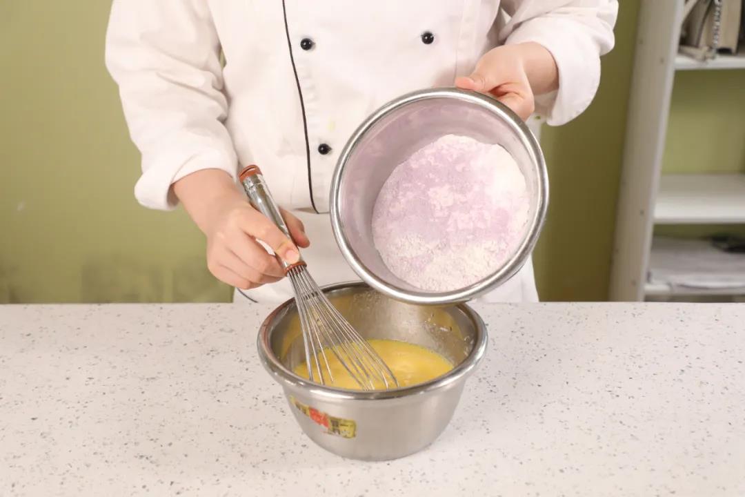 淡奶油加糖打發(fā)至八成,加入芋泥混合均勻;