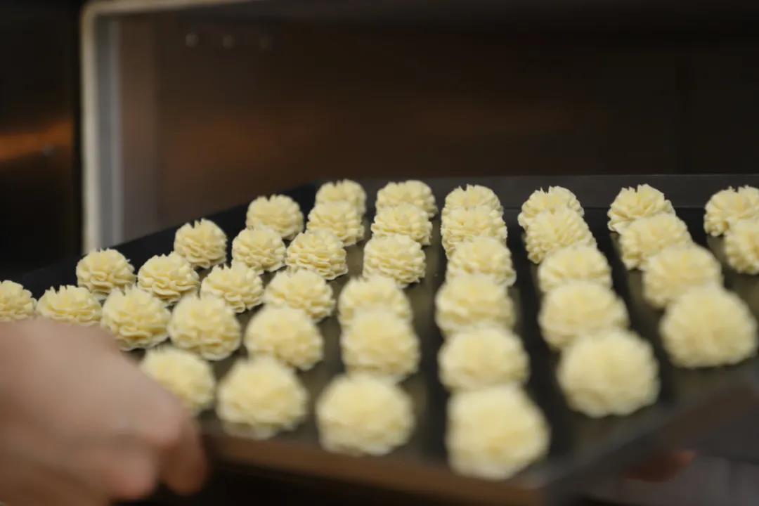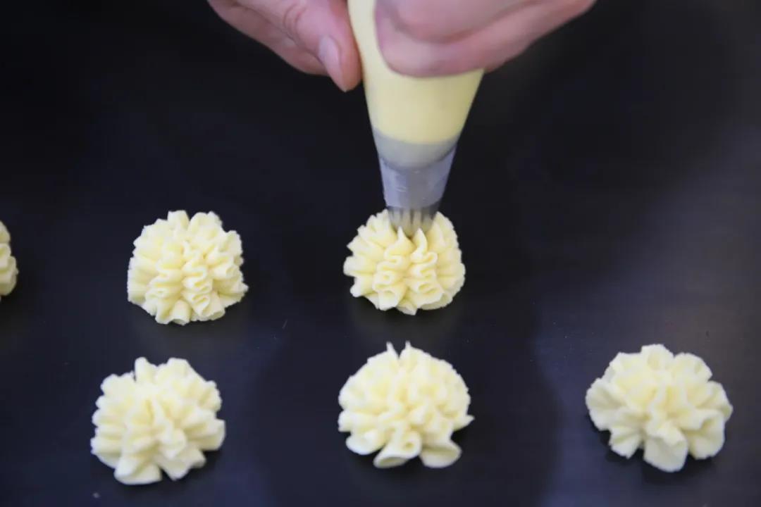 用SN6065裱花嘴擠在干凈烤盤上,10g/個(gè),