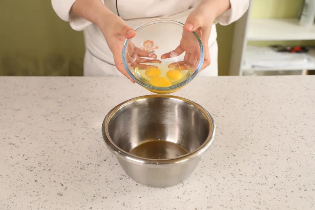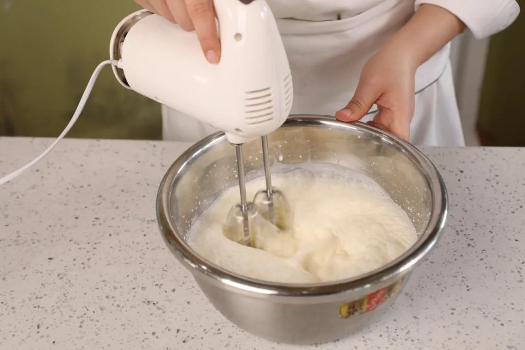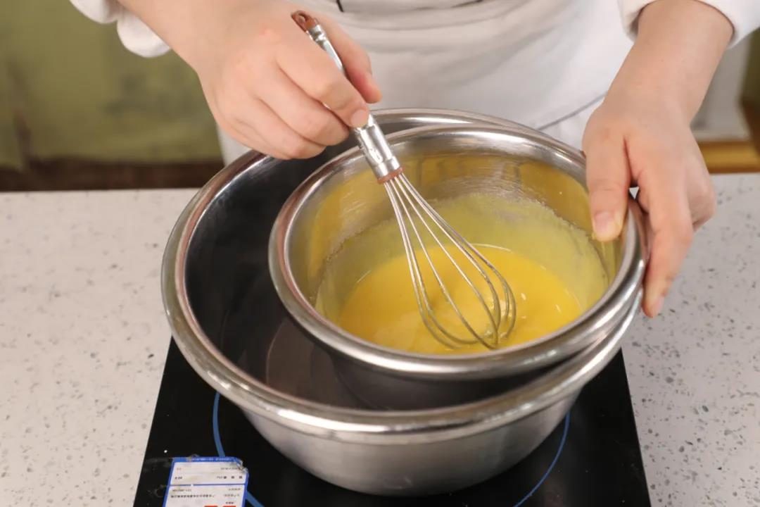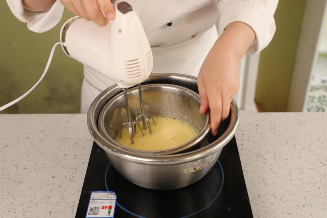 1. 雞蛋、糖隔熱水加熱至45℃左右,充分打發(fā);