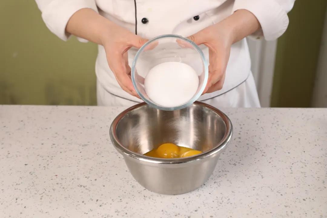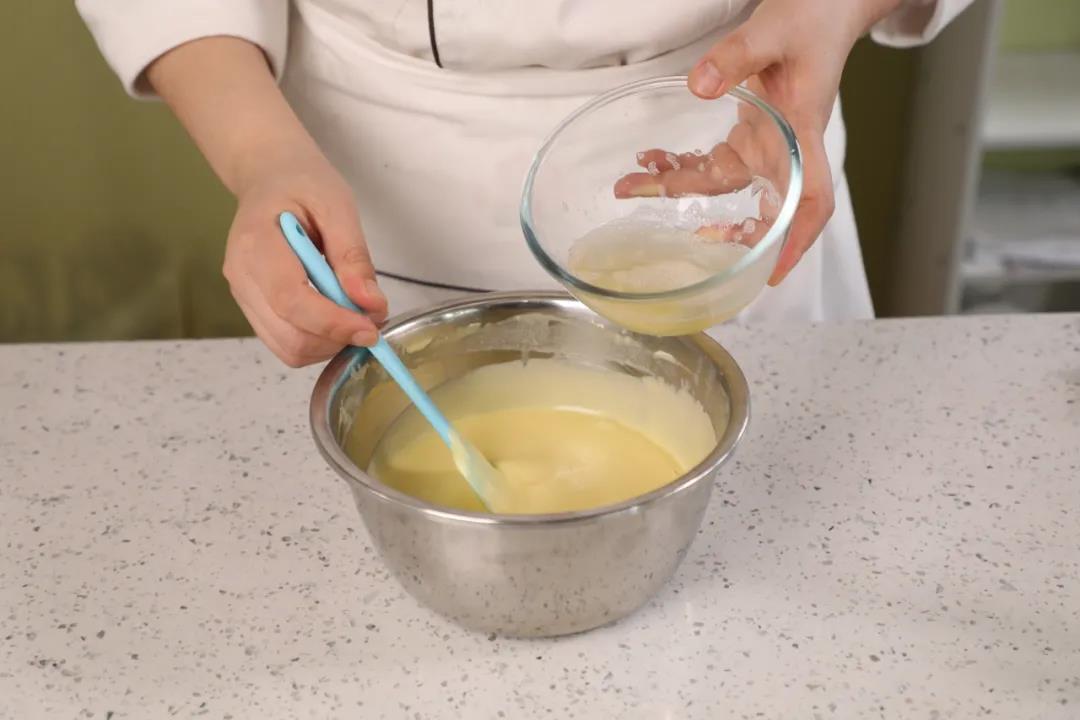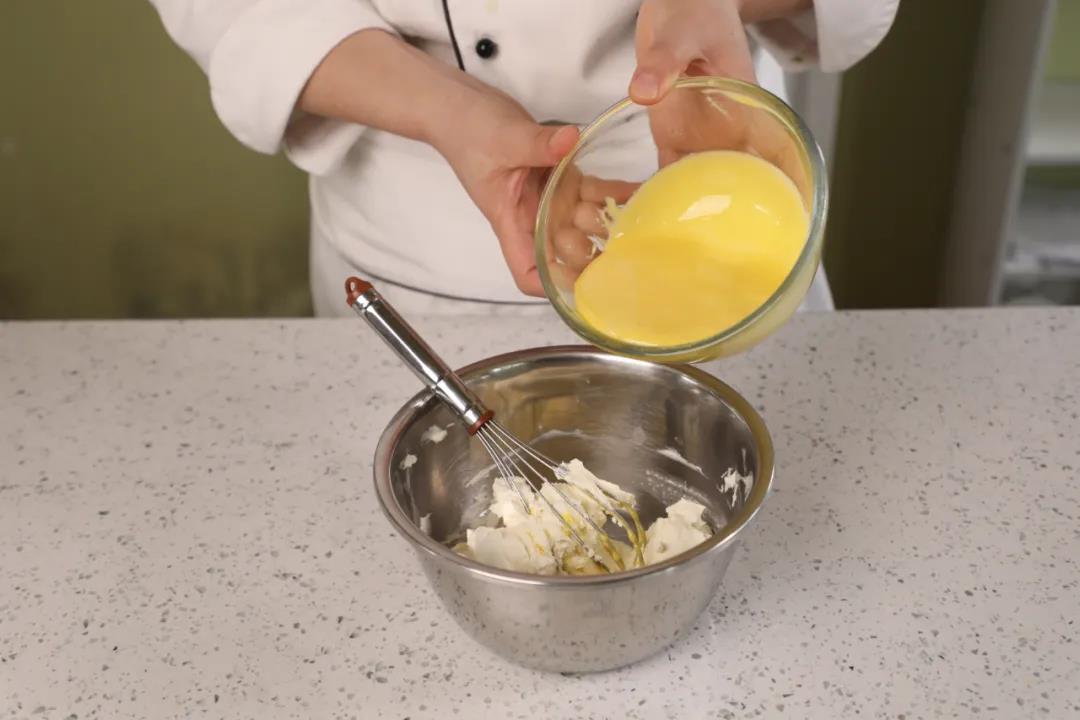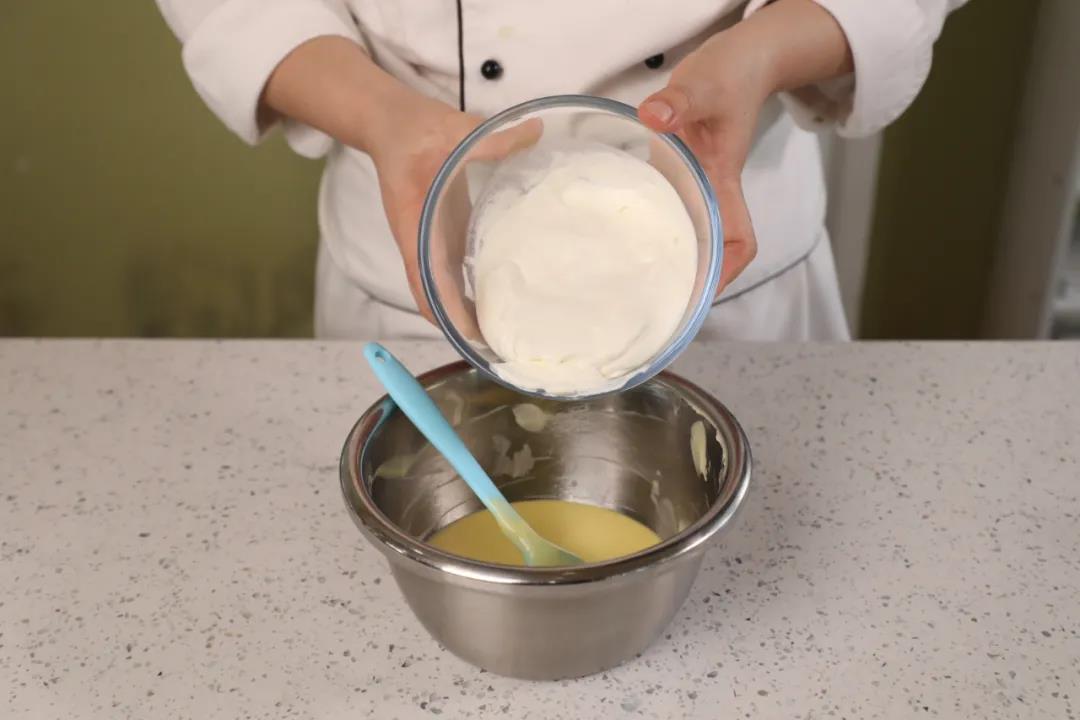 9. 蛋黃和糖混合,隔熱水加熱至83℃,分次加入到馬斯卡彭芝士中攪拌至順滑無(wú)顆粒;