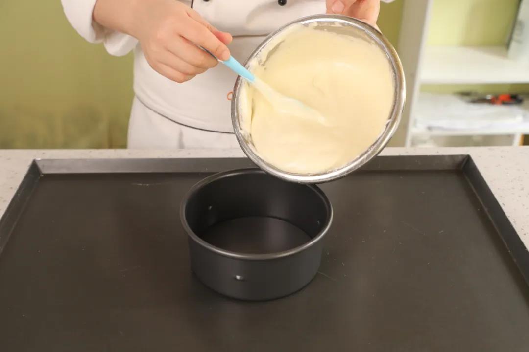 2. 加入過(guò)篩的低粉翻拌均勻,倒入6寸模具;
