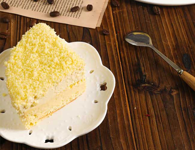 12. 脫模,蛋糕表面涂抹一層剩余的芝士慕斯糊,把剩余的蛋糕搓成碎屑,沾蛋糕碎屑在表面即可。