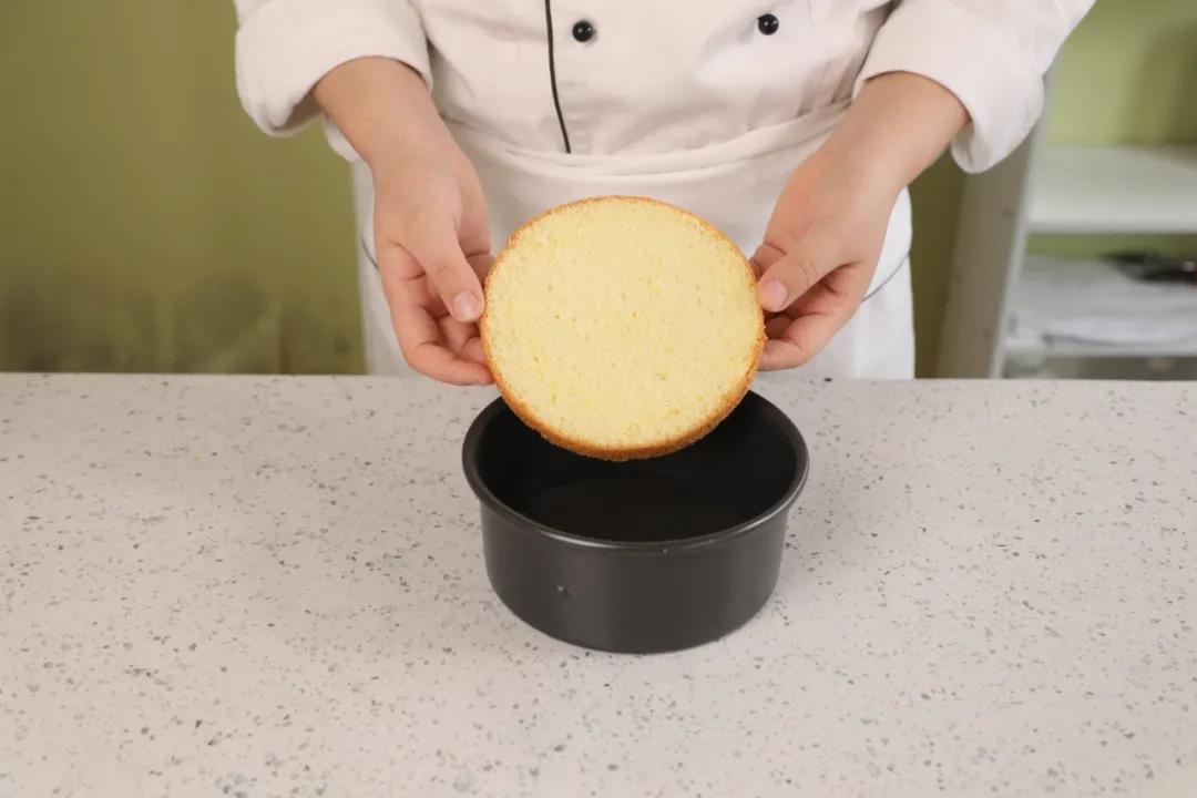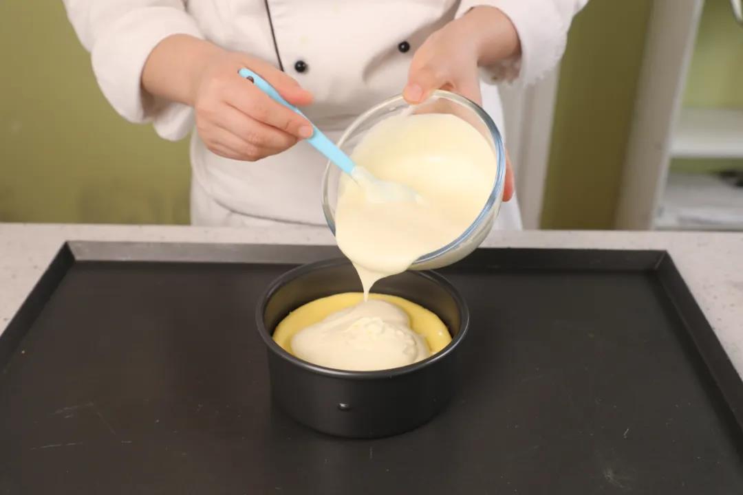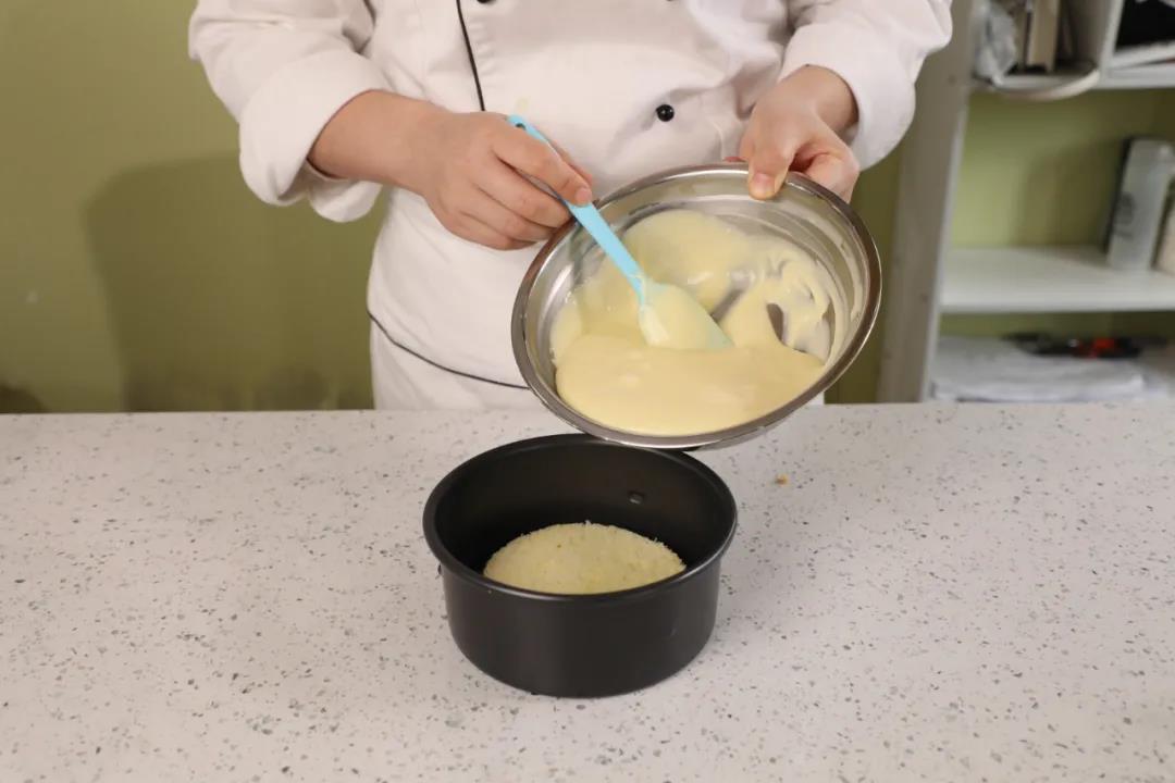 8. 把烤好晾涼的蛋糕胚片至1cm厚,墊入模具底部,把做好的芝士糊倒入,進(jìn)烤箱烘烤,150℃/150℃ 40分鐘左右;