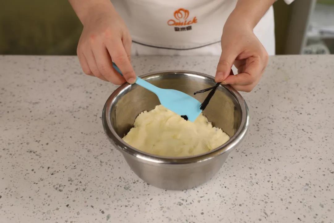 4. 奶油奶酪隔熱水加熱軟化,加入香草籽、糖攪拌至順滑無(wú)顆粒;
