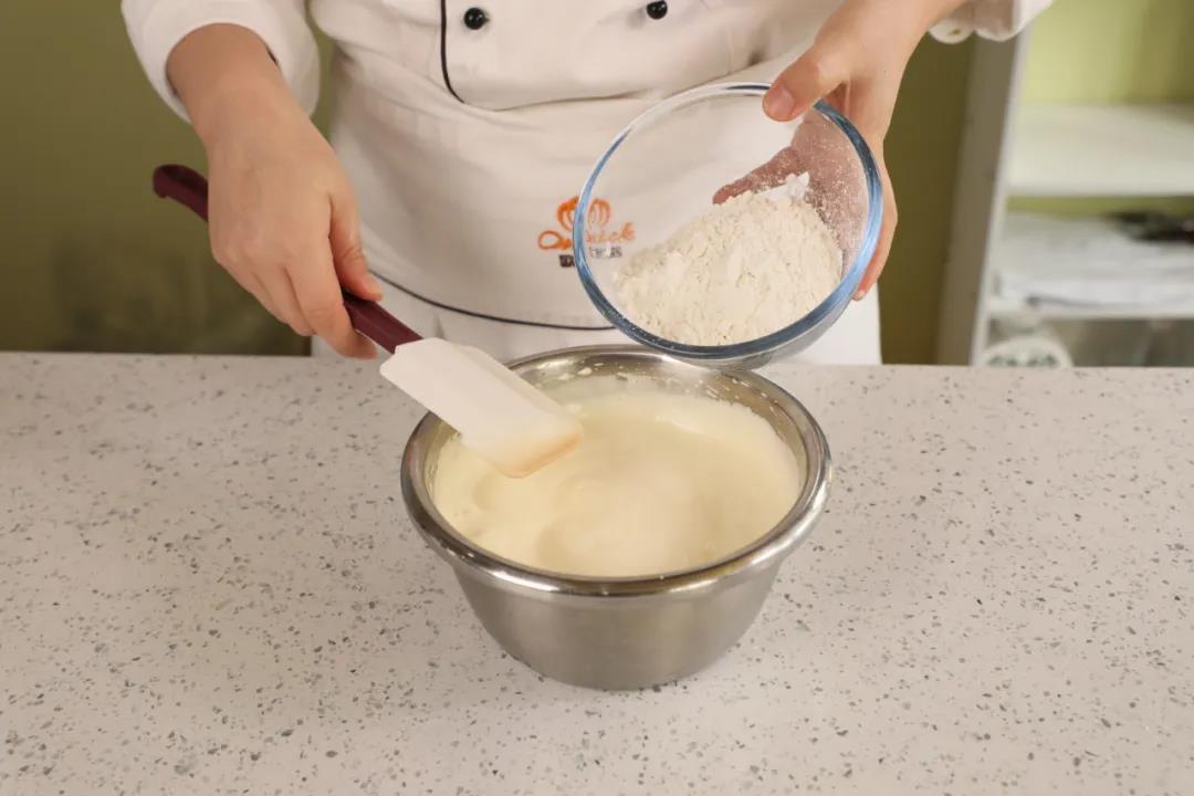 7. 加入過(guò)篩的低粉攪拌均勻,過(guò)篩;