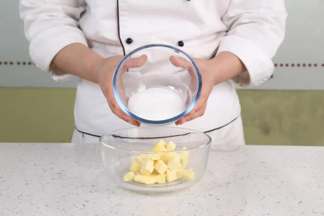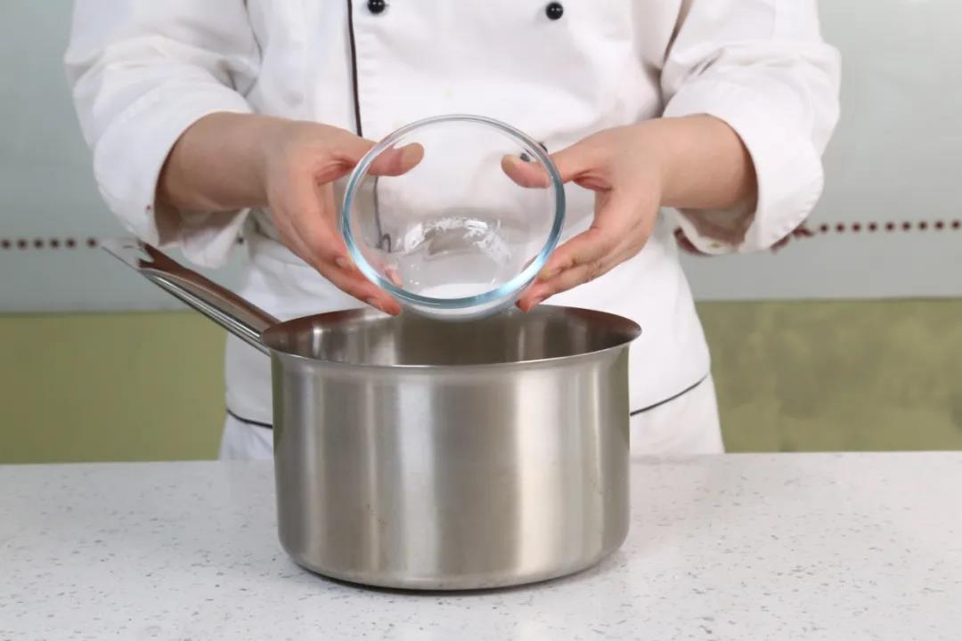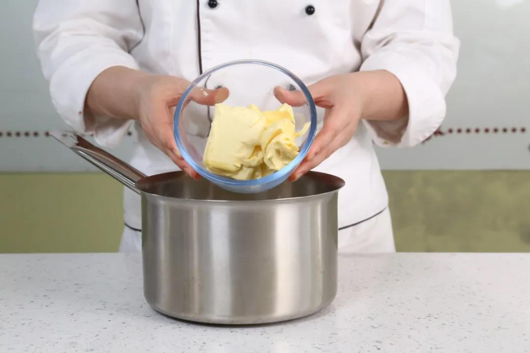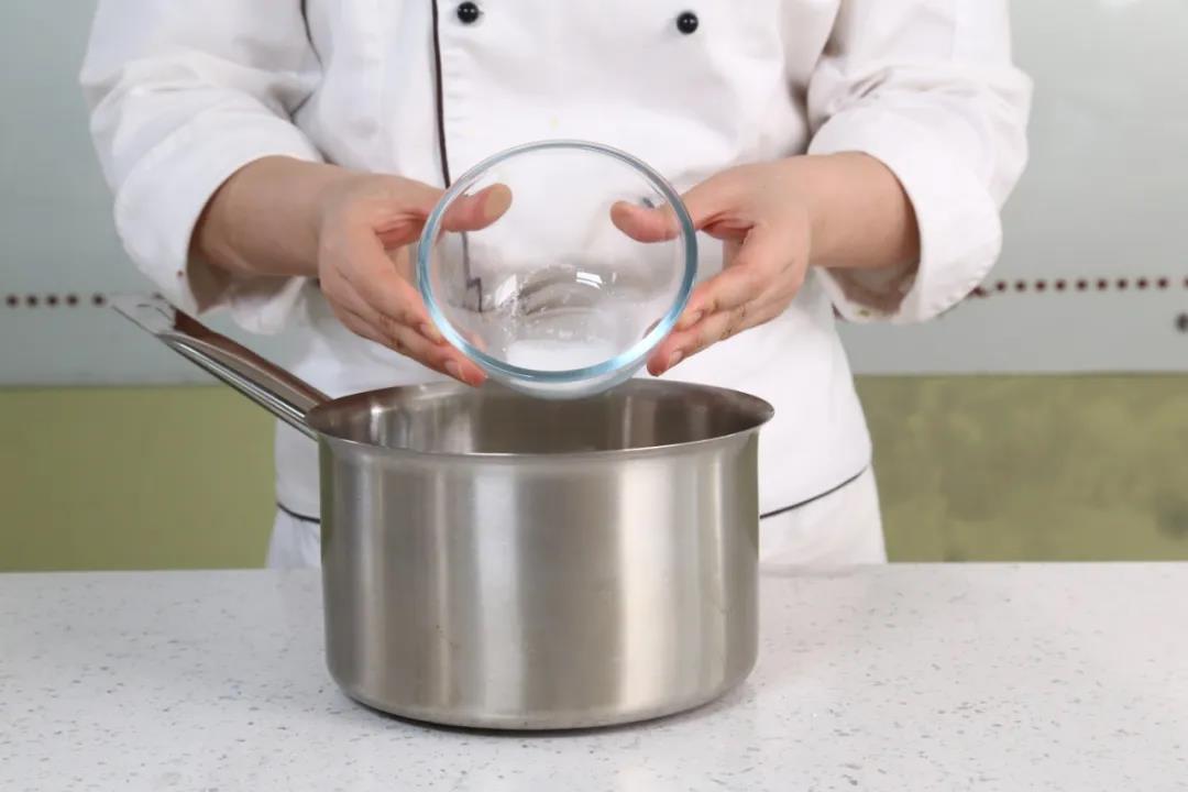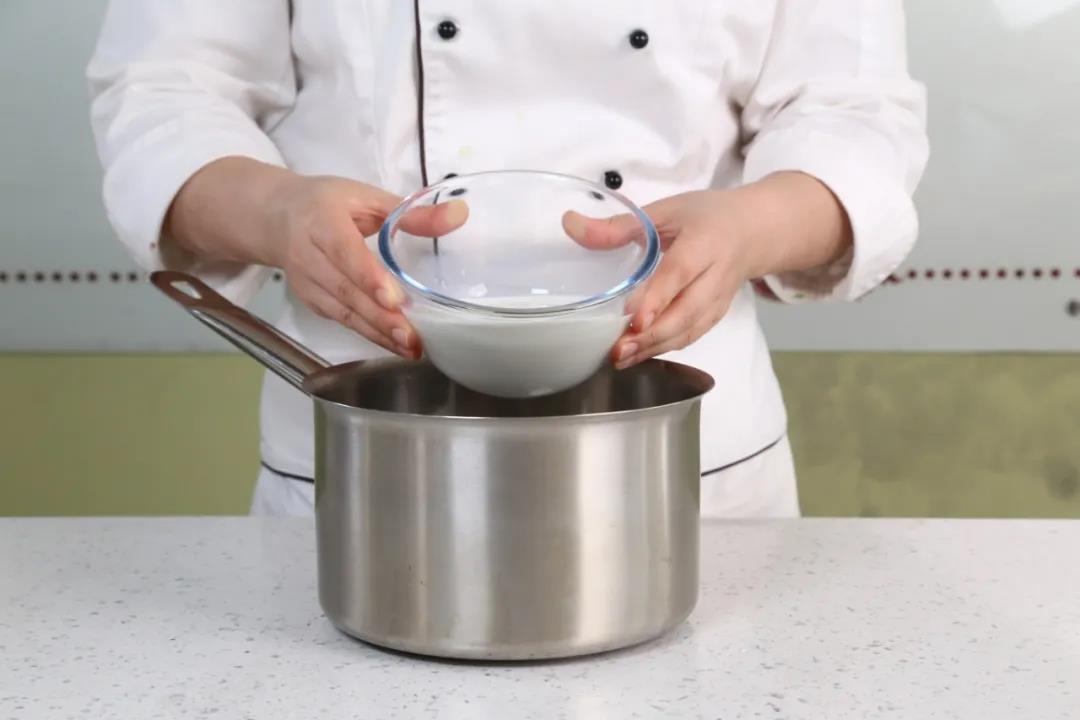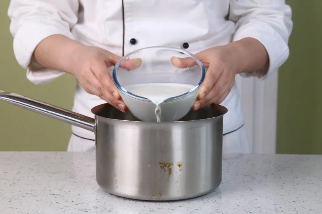 水、牛奶、黃油、糖、鹽置于鍋中,