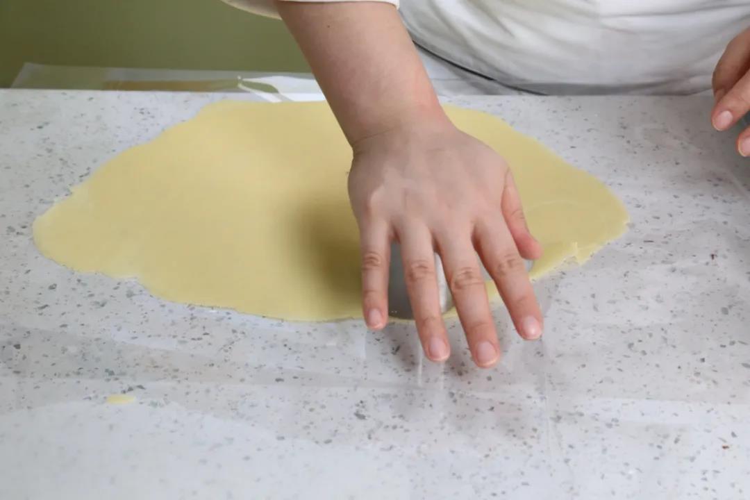 再加入過篩的低粉混合成團,搟至0.2cm厚,冷凍備用。