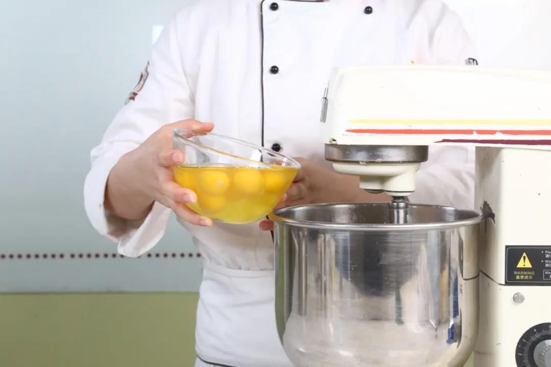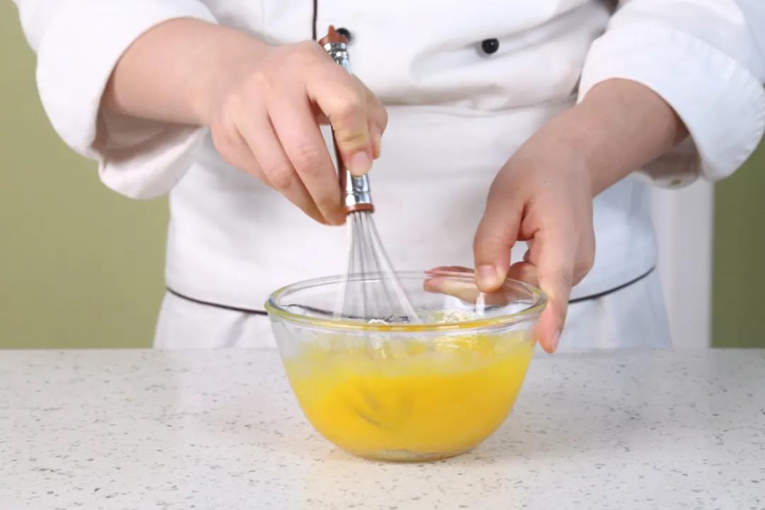 把煮開的牛奶沖入蛋黃中,邊沖邊攪,