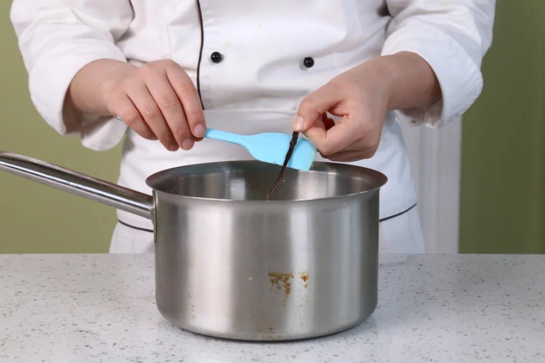 翻炒至鍋底出現(xiàn)糊膜,倒入攪拌機中降溫至45℃左右,