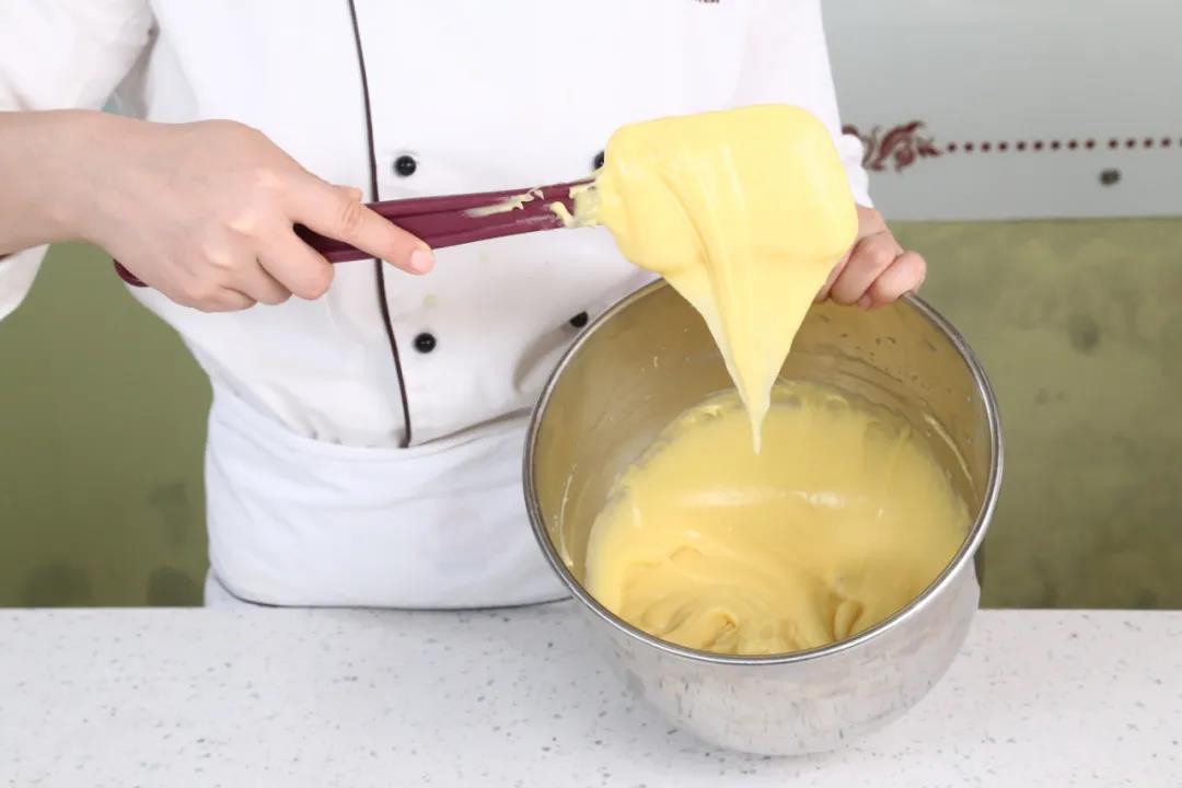 分次加入雞蛋,直至面糊挑起形成倒三角;