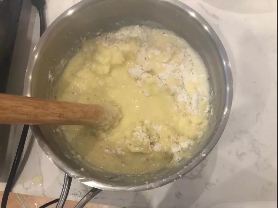 1、水,牛奶,黃油放在鍋中,加熱煮沸。