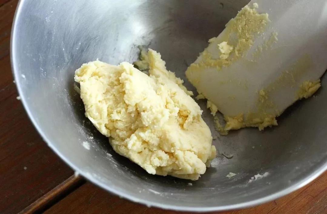 2、關(guān)火,加入過(guò)篩的低粉用刮刀攪拌成團(tuán)。