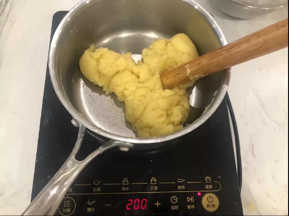 3. 面團(tuán)攪拌均勻成團(tuán),看不見(jiàn)干粉后,繼續(xù)用鍋加熱,并不停翻動(dòng)面團(tuán),直至在鍋底形成薄膜為止,關(guān)火。