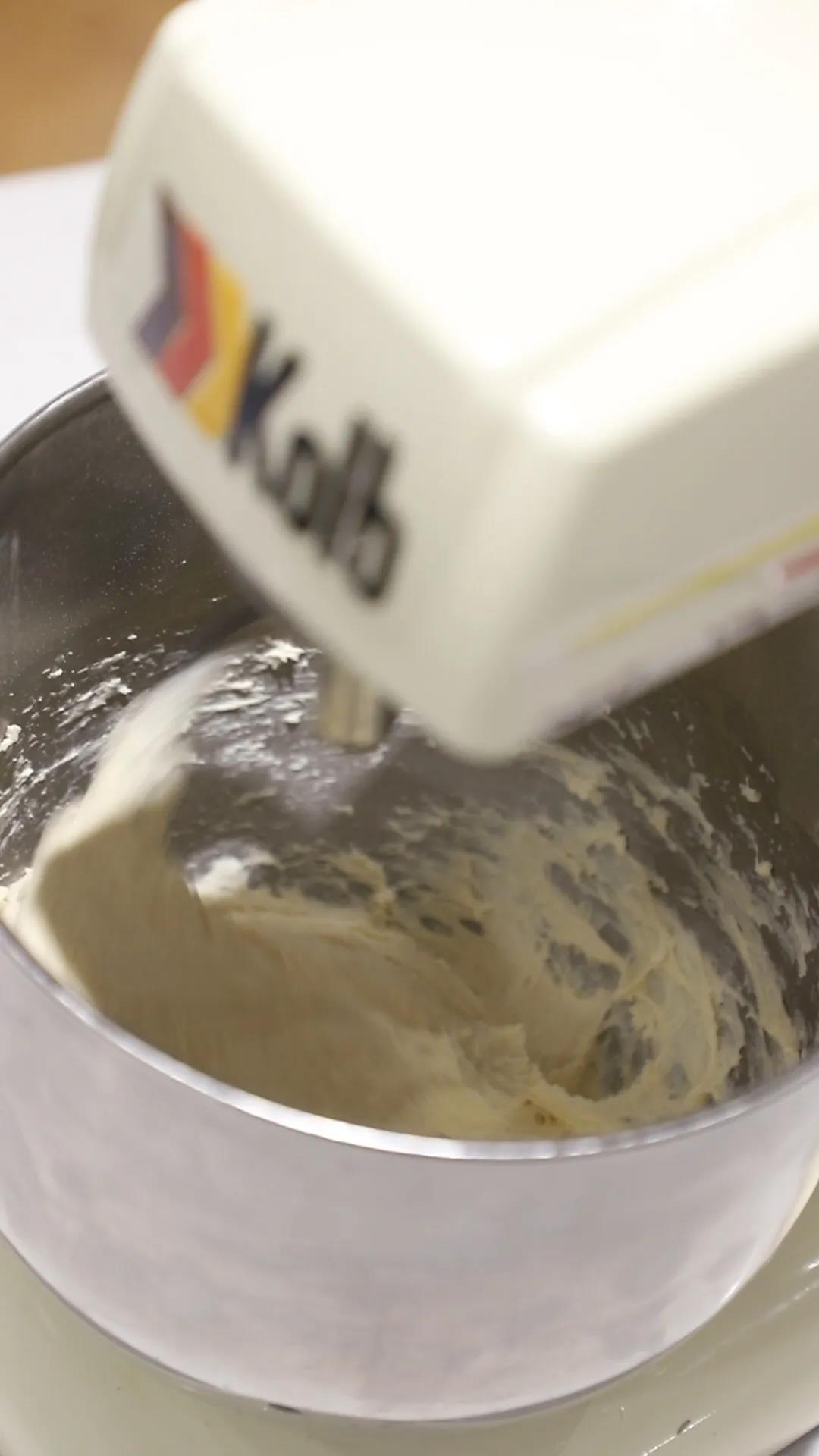 1.先將黃油、細砂糖完全打發(fā);