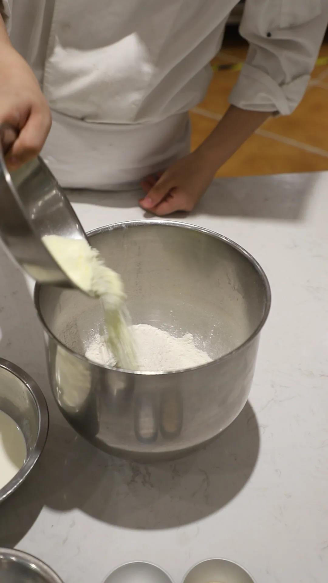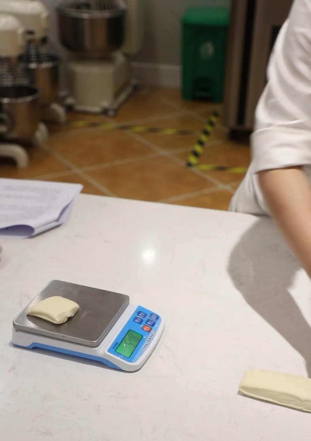1.攪拌:先將濕性材料、面粉、酵母、鹽、老面一起先慢速打均勻,然后快速打至5~6成,將提前切好軟化的酥油放入一直打至光滑有韌性6~7成(不是太軟,面團溫度 26度);