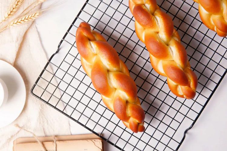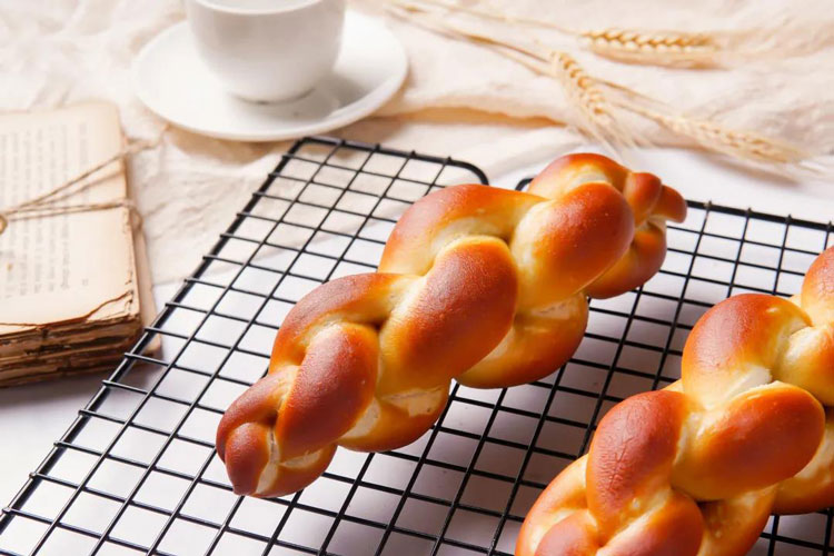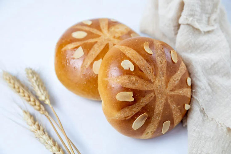 丹麥面包的加工工藝復(fù)雜,經(jīng)過(guò)攪拌和發(fā)酵之后,將經(jīng)過(guò)3h以上低溫發(fā)酵的面團(tuán)滾壓成厚約3cm的面片,再進(jìn)入折疊工序,使包入面團(tuán)中的油脂經(jīng)過(guò)該工序產(chǎn)生很多層次,面皮和油脂互相隔離不混淆。出爐后表面 刷油,冷卻后撒上糖粉或者果醬來(lái)裝飾。常見(jiàn)的有牛角包、果醬酥皮包,口感酥軟、層次分明、奶香味濃、面包質(zhì)地松軟。