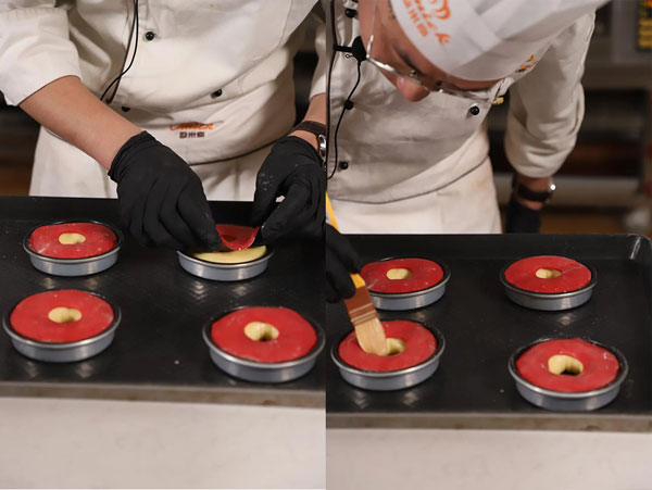 4.蓋上醒發(fā)定型并刷上蛋液的面團(tuán)上。