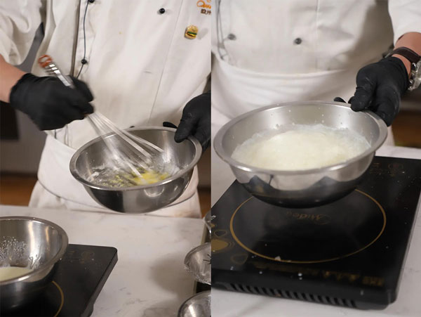 2.牛奶+細(xì)砂糖放小鍋煮開(kāi),糖融化,少量多次倒入蛋黃液中,每次攪拌均勻再倒下一次。