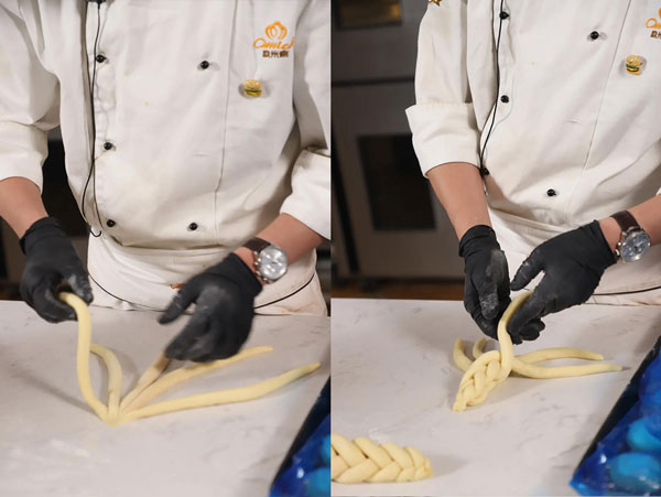 2.五根搓好的面團(tuán),頭部固定收緊。